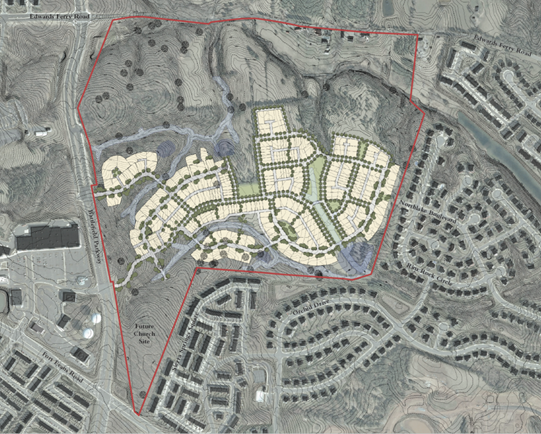To respect the farm’s topography, cultural settings, and natural environment, the design preserves the farm’s environmentally-sensitive areas. Homes will be sited away from Edwards Ferry Road in an attempt to preserve the historic roadway’s rural ambience and existing farm structures.