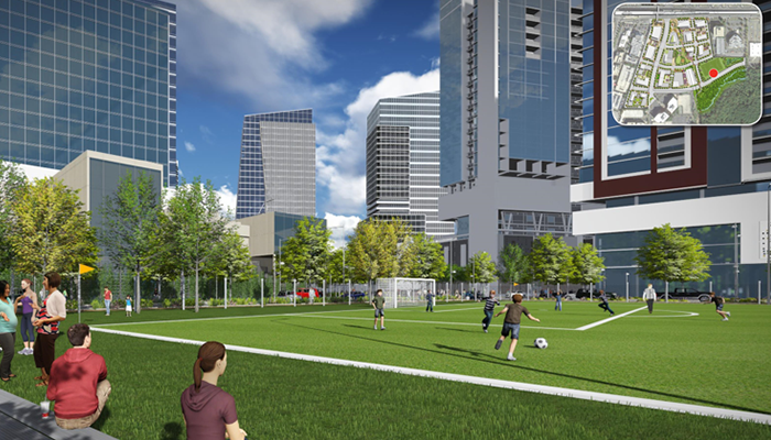The CARS property is currently developed with multiple car dealerships. The CARS application rezoned 12.2 acres from C-7 to PTC (Planned Tysons Corner Urban District) to transform the property into a vibrant, transit-oriented, mixed-use neighborhood with a total of 2,045,000 square feet of office, hotel, retail, and residential uses with an overall FAR of 3.92. Sunburst rezoned approximately 4.39 acres to the PTC District to convert the existing hotel site to a predominately high-rise residential development of 1,362,370 square feet with an option for an office building. The FAR for the Sunburst site is 7.13. Both applications included dedication of land for a new “urban format” Dominion Power electric substation serving Tysons and adjacent areas. CARS and Sunburst worked extensively with Dominion Power and County Staff to develop a plan that can accommodate the substation within the context of the new urban vision for Tysons. The applications included a full package of proffers with four new public streets and two private streets, a robust TDM program, 20% workforce housing, an extensive public park system with 5.8 acres of park on-site including an athletic field, park improvements on adjacent property, and additional contributions for athletic fields and stream restoration.